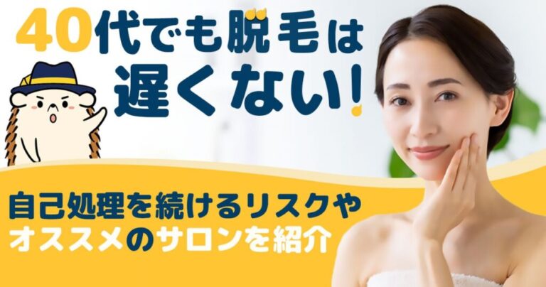 「40代で脱毛するのは遅い?」「40代からでも脱毛するメリットはある?」と疑問に思っていませんか?脱毛は若い子がするものだとイメージされている方も多いでしょう。 しかし、脱毛を始めるのに40代だと遅いということはありませ … 続きを読む 40代でも脱毛は遅くない!自己処理を続けるリスクやおすすめのサロンを紹介