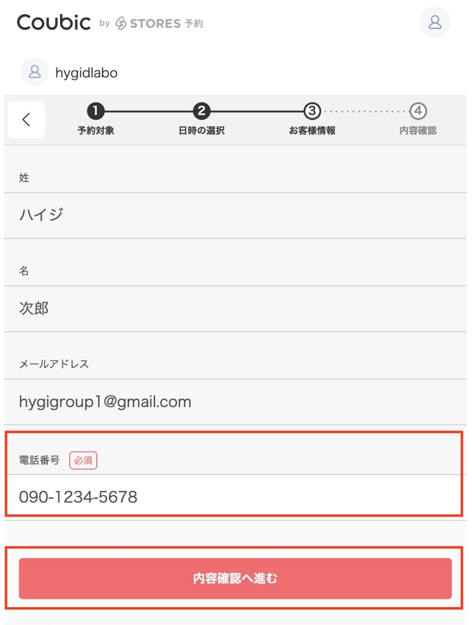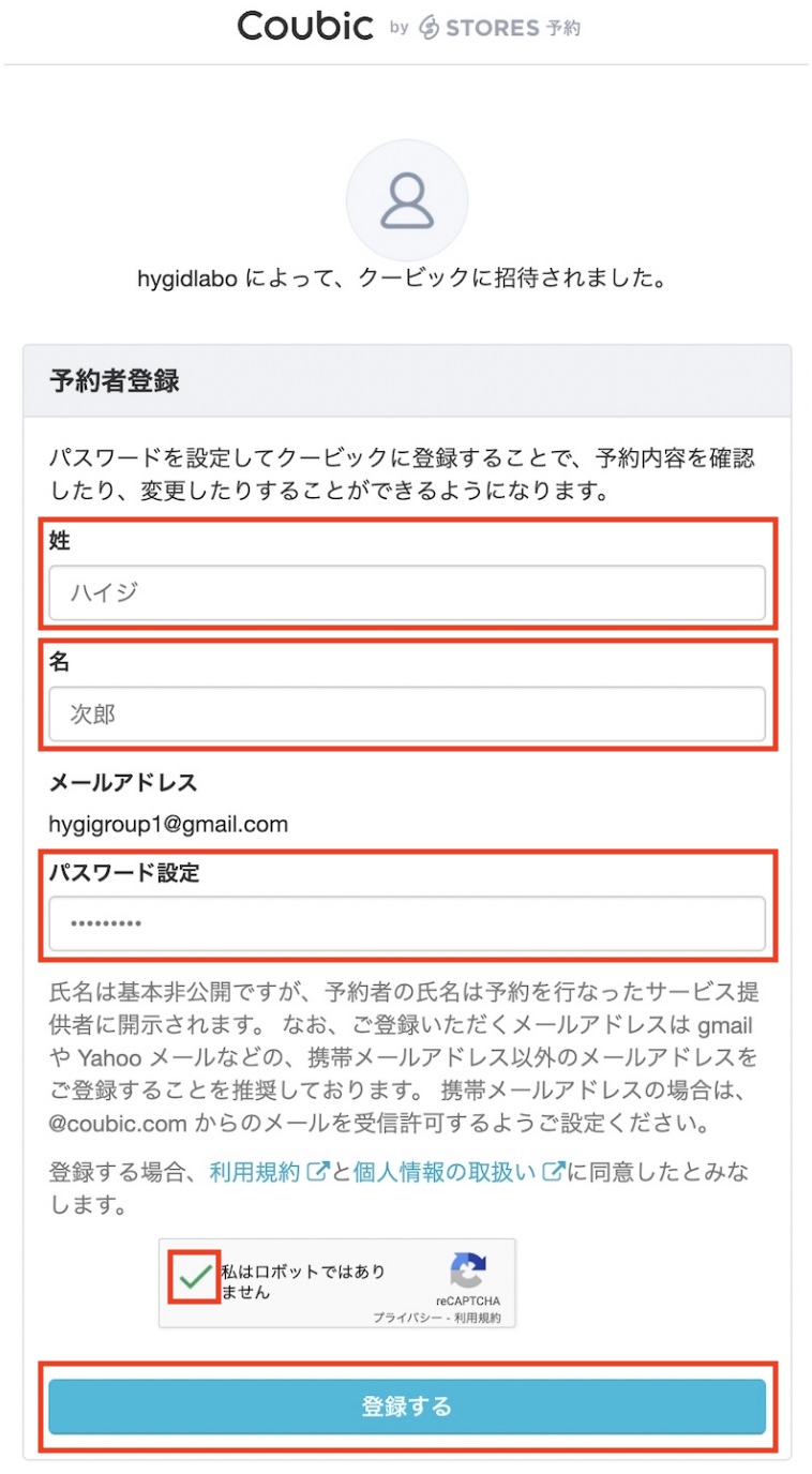 予約システム「Coubic」登録の姓名・パスワードを登録