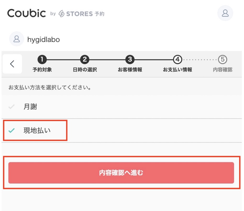「現地払い」を選択し「内容確認へ進む」