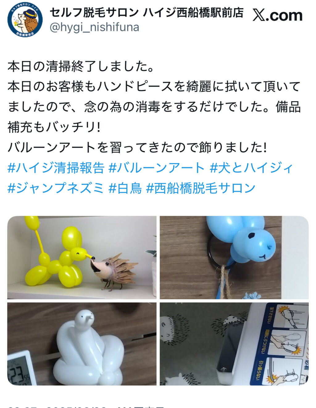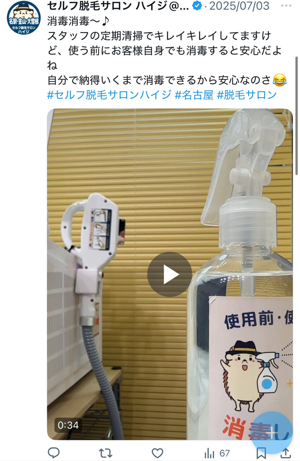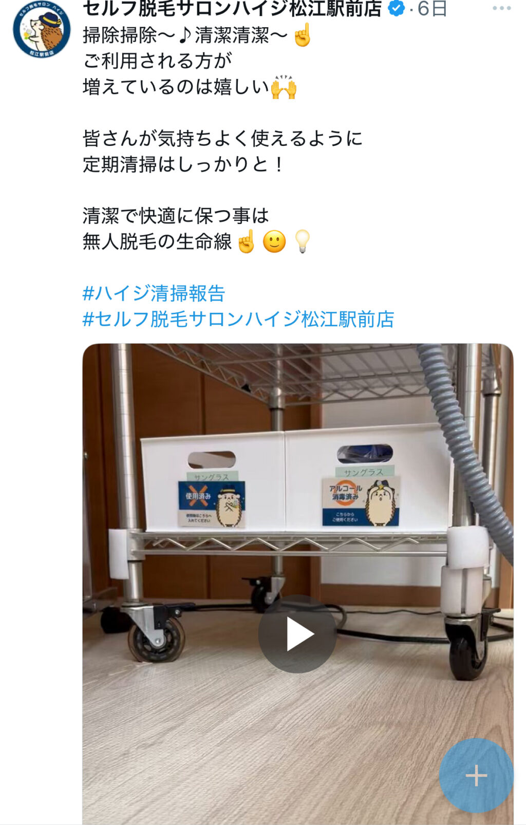 セルフ脱毛サロンハイジでは各店舗で日々実施している清掃の様子を、X(旧Twitter)にて「#ハイジ清掃報告」のハッシュタグを用いて公開する取り組みを開始しました。